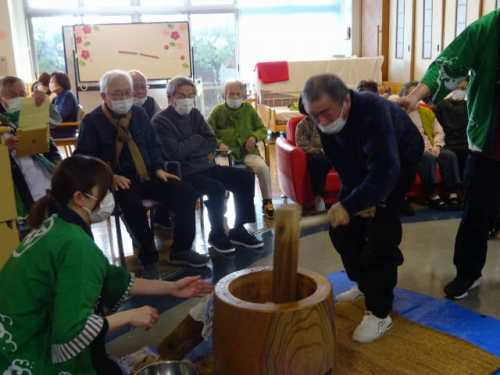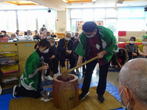 その後、利用者、職員全員の「よいしょ!」の掛け声に合わせながら餅つきを行いました!