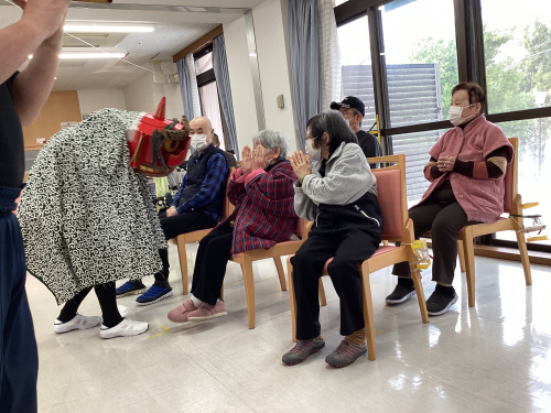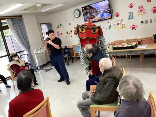続いて食堂に場を移し、笛の音で獅子舞が登場