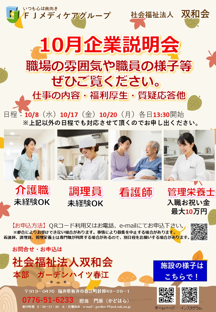 皆さまこんにちは。すっかり朝晩は秋となりましたがお元気でお過ごしですか?10月の企業説明会 日程をご案内します。週末以外は記載日以外でもお受けしますので、ご希望があればQRコードからお気軽にご連絡下さい!